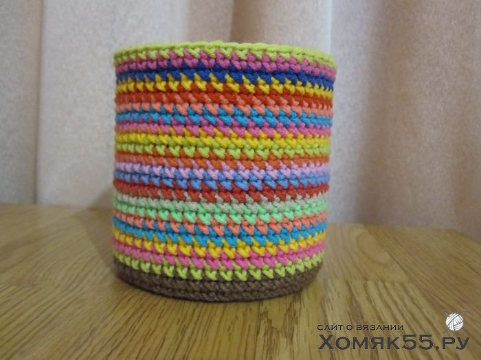 После того как вязание окончено получаем вот такой чехольчик на нашу баночку для фломастеров.