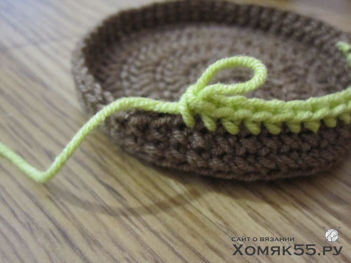 Провязав два ряда меняем цвет на салатовый и снова провязываем ряд столбиками без накида.