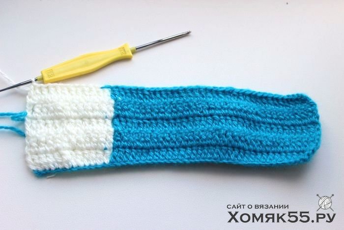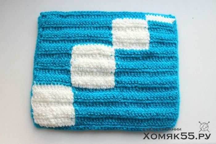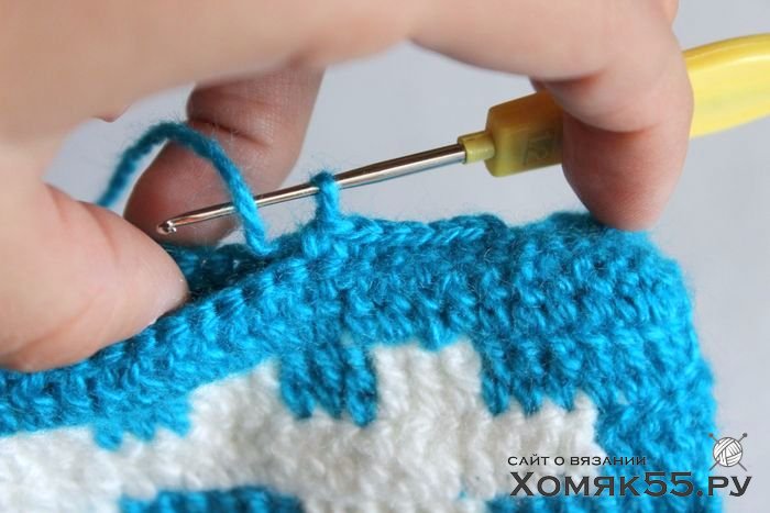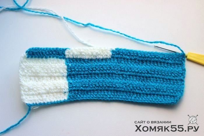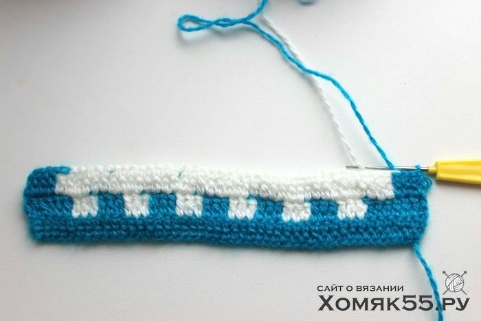 Первый ряд выполняется голубой пряжей, во втором используются уже оба цвета. Ничего обрезать не нужно, нити просто переплетаются с изнанки изделия. Вот как будет выглядеть законченный третий ряд: