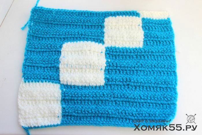 Теперь ее нужно отложить в сторону и заняться второй стороной. Для этого набираются все те же тридцать петель, вяжется такой же квадрат. Переплетение нитей может быть любым. Хорошо будет смотреться простое голубое или белое полотно, полосатое или в клеточку. Здесь выбран вариант с квадратами различной величины: