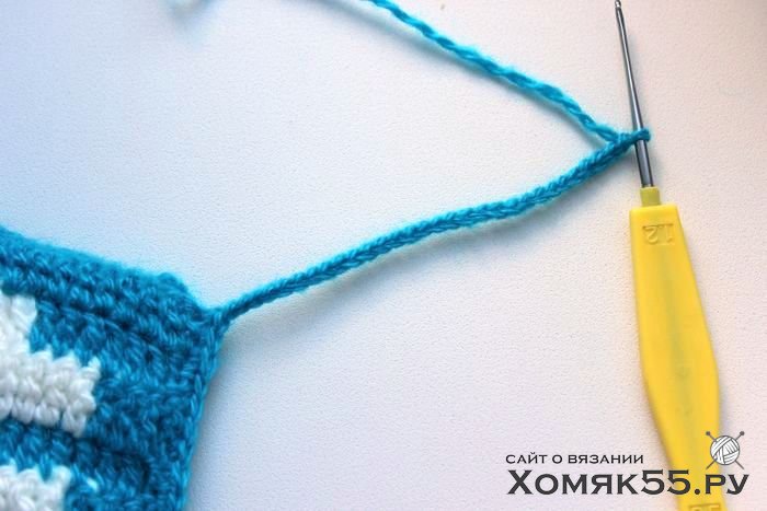 При помощи полустолбика ее нужно присоединить к полотну прихватки и закрепить нить.