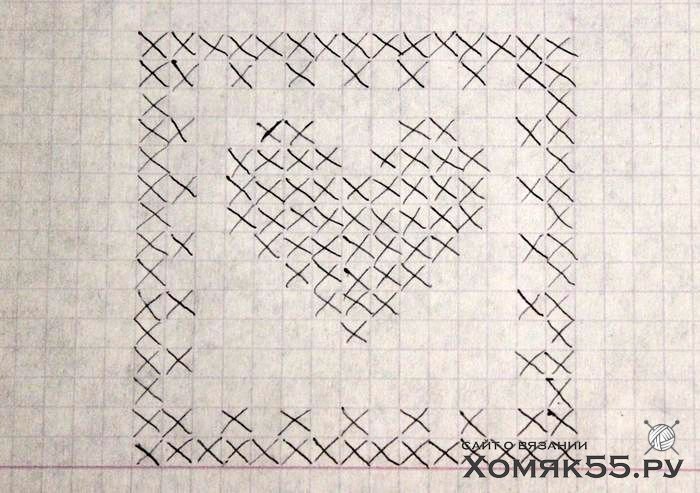 Прихватку нужно вязать столбиками с накидом, опираясь на нижеприведенную схему. Крестиками обозначены заполненные клетки, выполненные голубой пряжей (в одной клеточке четыре столбца).