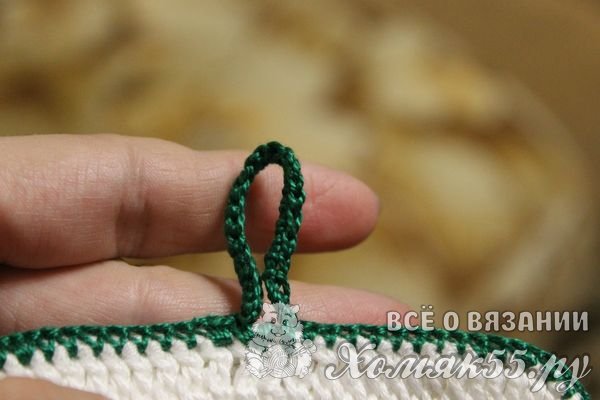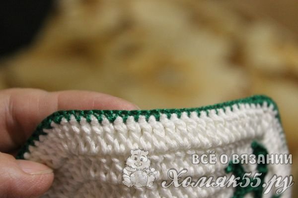 Чтобы скрепить между собой стороны прихватки, нужно обвязать их через край рядом обыкновенных полустолбиков. Здесь выбрана зеленая пряжа, но при желании можно взять любой цвет, который использовался для создания элементов готового изделия и больше гармонирует с гаммой кухни.