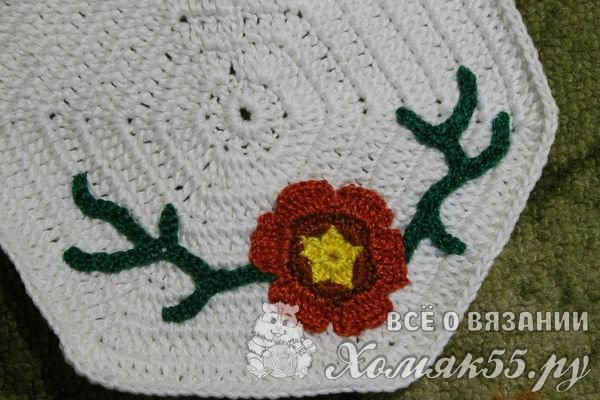 Прихватка «Цветочная полянка» состоит из нескольких отдельно связанных крючком частей. Это два основных поля, цветок и две зеленый веточки.
