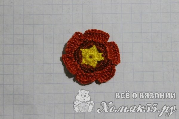 Для первого ряда использована ярко-желтая нить, для второго и третьего больше подошел коричневый цвет, лепестки стали кирпичного оттенка. Готовый цветок: