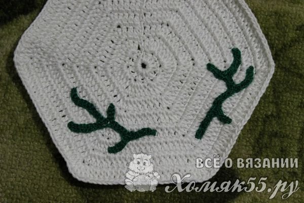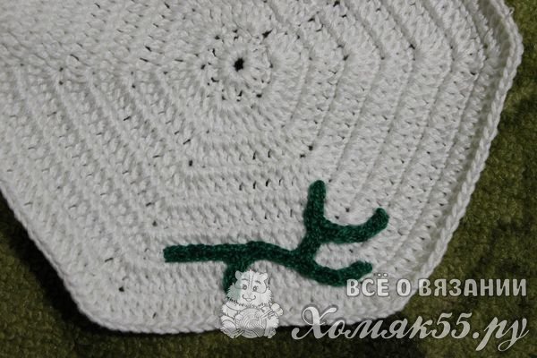 Теперь можно складывать все детали в готовую прихватку. Сначала на любую из сторон крепится веточка: