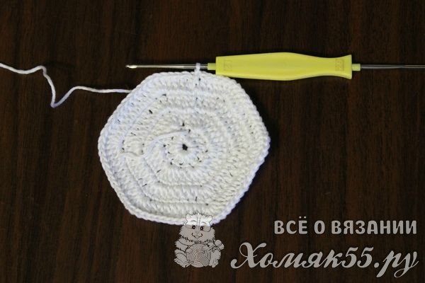 Когда будет закончен четвертый ряд, станет ясно видна шестиугольная форма прихватки. Столь оригинальные очертания придают дополнительную изюминку готовому изделию: