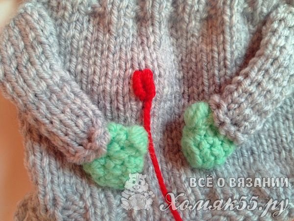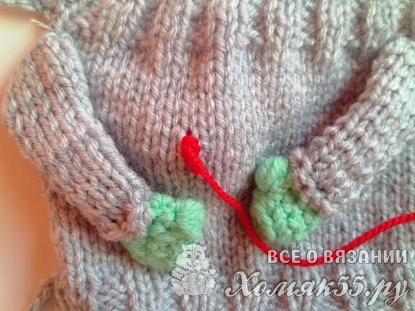 А на другой стороне свитера пришиваем пуговки в тон варежкам. Пришиваем ручки к свитеру.