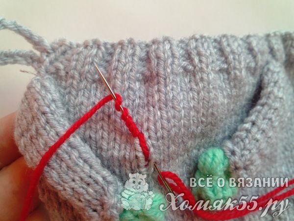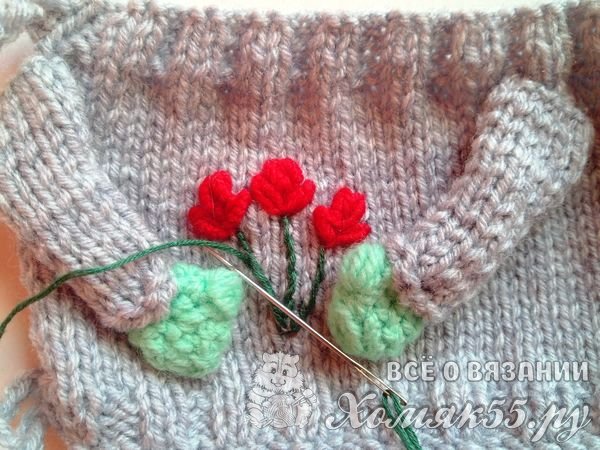 И теперь сделаем вышивку красной пряжей. Это будут тюльпанчики. Крепим нитку на свитере. Вводим иголку и выводим через пять миллиметров. Накручиваем на иголку нитку пять раз.