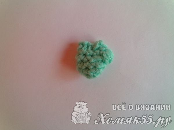 Теперь свяжем маленькую варежку. Ее будем делать крючком. Делаем скользящую петельку и в нее шесть столбцов без накида. В следующем ряду делаем три прибавки. А в третьем в начале ряда вяжем палец. В одну петлю нам нужно выполнить пять столбцов с накидом и с одной вершиной. То есть мы делаем накид, вводим в петлю крючок и достаем рабочую нить. И так еще четыре раза, а потом все вместе петельки с крючка провязываем одной петлей. И в следующем ряду делаем три убавки.