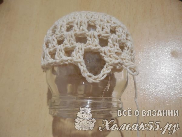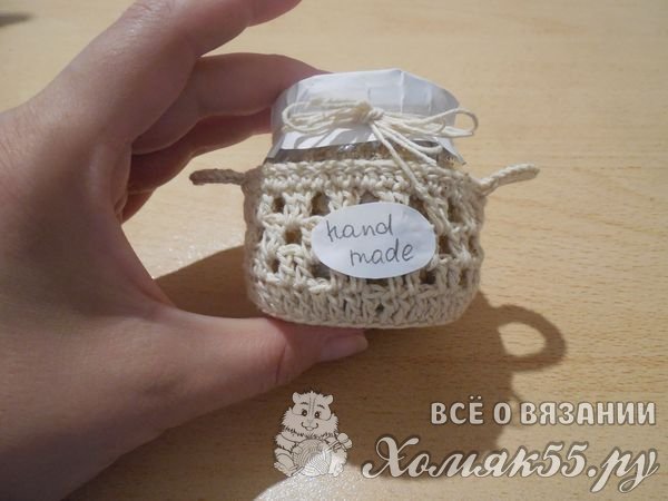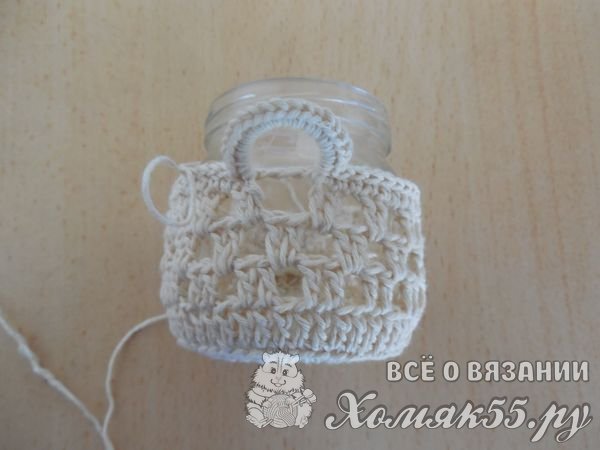 Восьмой ряд вяжите как можно туже, можно даже взять крючок меньшим номером. Ручку обвяжите двадцатью столбиками без накида (во время вязания их придется сдвигать пальцами к началу обвязывания).