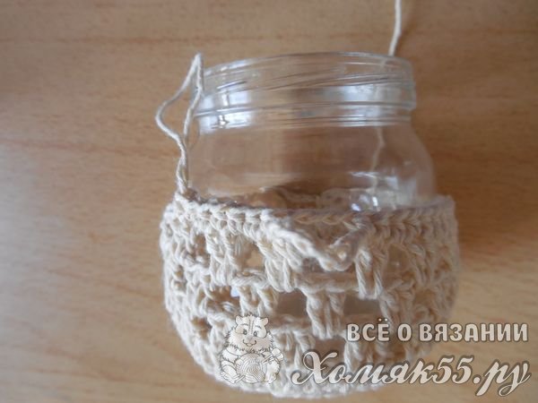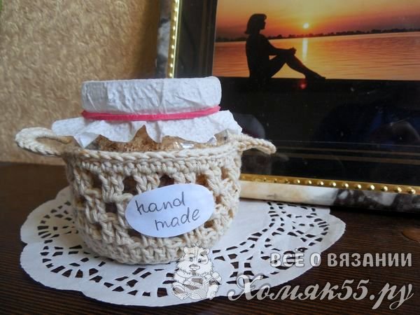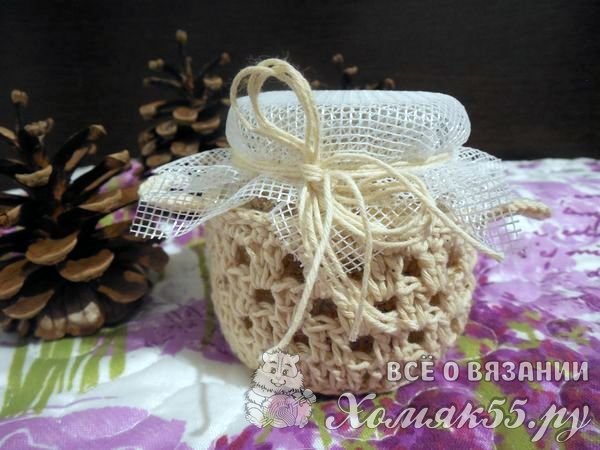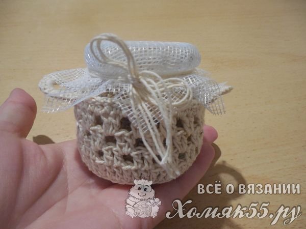 Наполните горшочек, положите сетку на горшочек и завяжите на горлышке нитками, которыми вязали корзинку или красной резинкой.