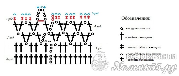 Небольшие пояснения к схеме: в шестом ряду сделайте две «ручки» из восьми воздушных петель. Первую видно на схеме, вторую вяжите точно так же через восемь двойных столбиков (22-е петли).