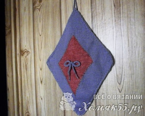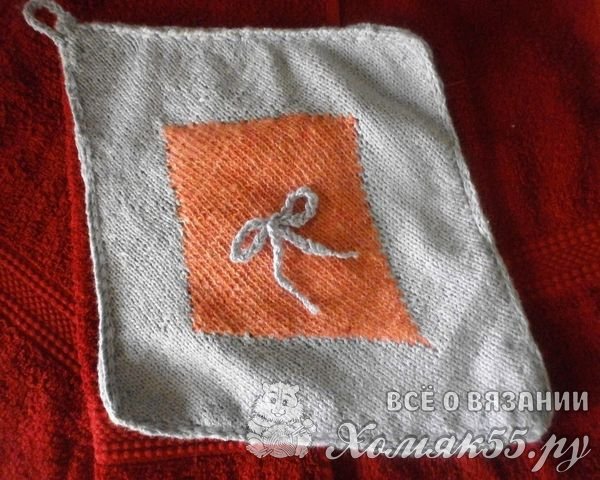 Вывязываем крючком петельку из воздушных петель. При желании можно украсить бантом связанным крючком или сделанным из атласной ленты. Я думаю, мои советы по рукоделию, помогут Вам сделать своими руками такую же прихватку.