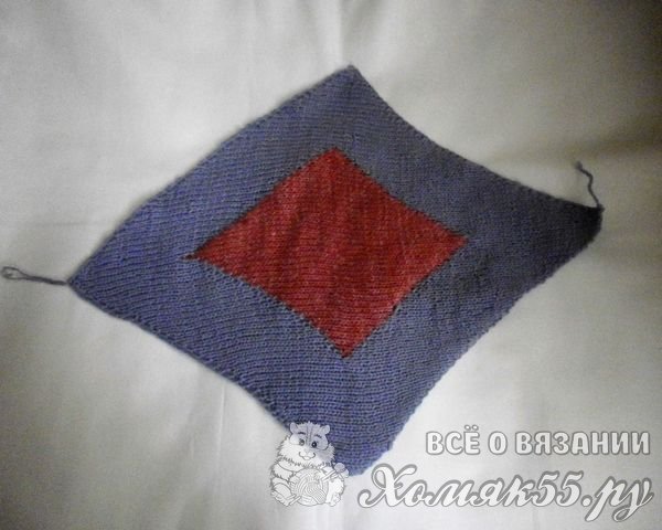 Начинаем вязать прихватку с трех петель. Набираем на спицу три петли синего цвета и провязываем лицевой ряд. Затем изнаночный ряд. С 3 ряда начинаем прибавление по одной петле с каждой стороны.