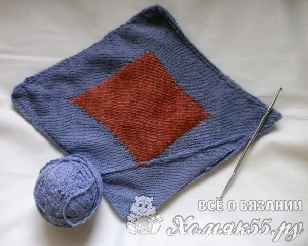 В одной из деталей, посередине можно вывязать квадрат, вплетая нитку другого цвета.