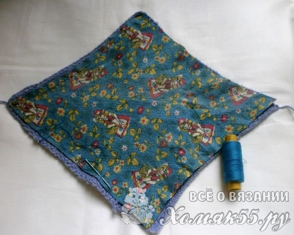 Вторую деталь прихватки – вяжем точно так же, как и первую. Между двумя частями прихватки – я еще положила кусочек ткани из байки, такой же формы. Чтобы наша прихватка была немного плотнее, и мы - не обожгли руки. Только сделала ее немного меньшего размера – отступив на сантиметр от края. Это нужно для того, чтобы было удобно соединять две связанные части крючком.