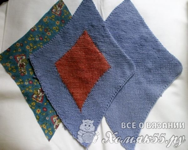 Перед тем, как соединять две вязаные детали, я пришила нитками с изнаночной стороны, к одной из вязаной детали – ткань.