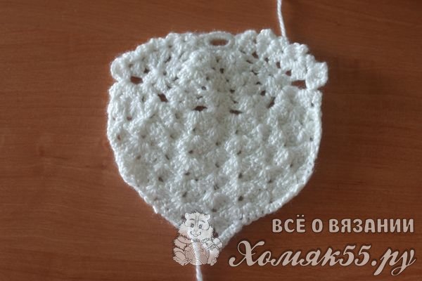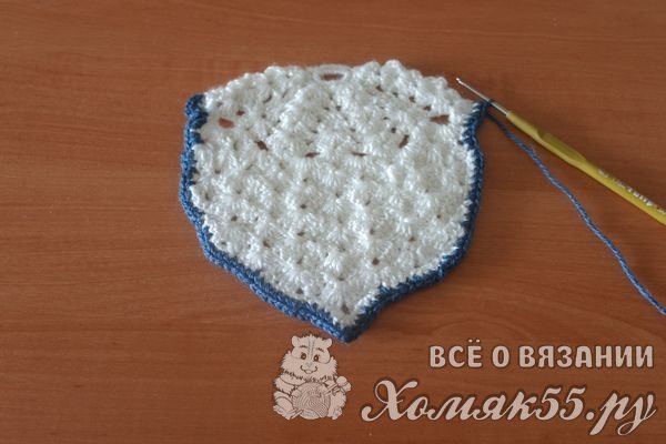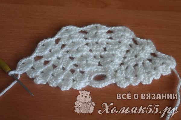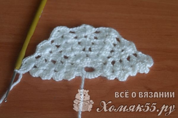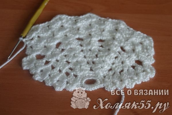Следующий ряд – делаем 3 воздушных петли для перехода на этот ряд. Вяжем из одной петли 3 столбика с одним накидом, потом делаем 2 воздушных петли и из этой же петли еще 3 столбика с одним накидом. Отступаем 2-3 петли, вяжем столбик с одним накидом, еще 2 воздушных петли и повторяем еще 3 таких лепестка.