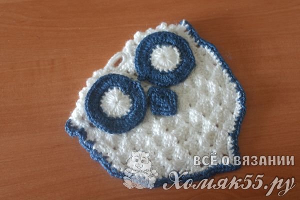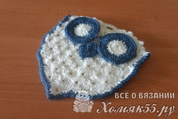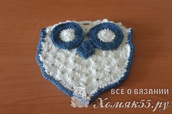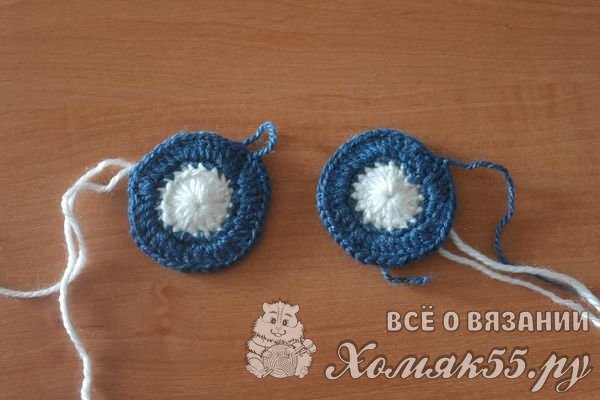 Из столбиков с одним накидом вяжем 2 круга – это глаза совенка.