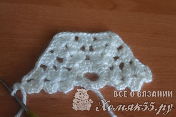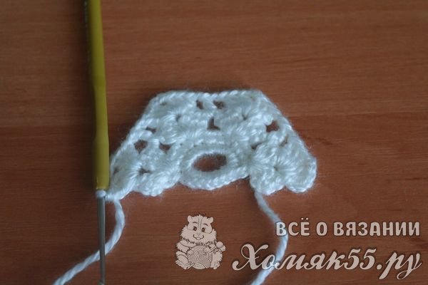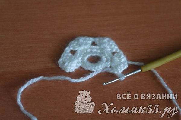 Следующий ряд – делаем 3 воздушных петли для перехода на этот ряд. Вяжем из одной петли 3 столбика с одним накидом, потом делаем 2 воздушных петли и из этой же петли еще 3 столбика с одним накидом. Отступаем 2-3 петли, вяжем 4 столбика с одним накидом, еще 2 воздушных петли и повторяем еще 3 таких лепестка.