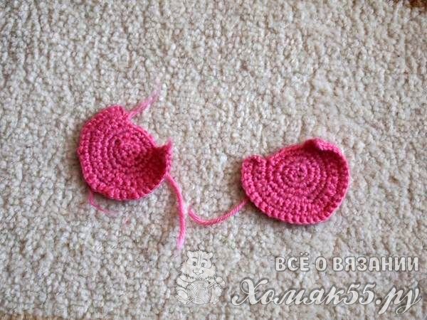 Из розовой пряжи вяжу 2 круга диаметром 4 см, а затем разворачиваю каждый круг и обвязываю их на длину трех секторов круга. Получаются крылышки цыпленка.