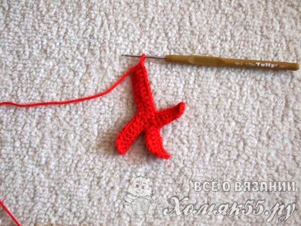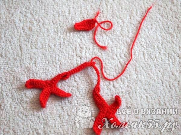 Произвольно вяжу лапы из воздушных цепочек красной пряжей и клюв. Цепочки обвязывают по контуру, утолщая лапки.