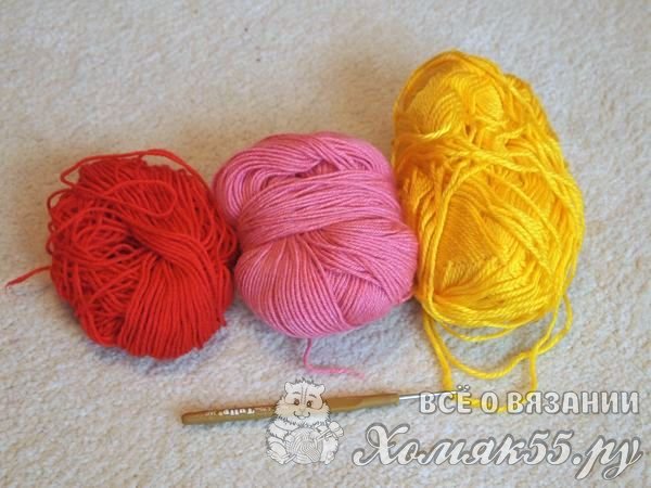 Для вязания прихватки я использовала остатки трех мотков акриловой мягкой пряжи. Ее преимуществом является то, что она не кошлатится.