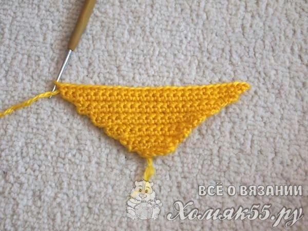 Для основания лапок делю все петли пополам. Их в ряду 35 штук. Для одной лапки провязываю 17 петель, формируя равномерное уменьшение петель до 5 в ряду. Чтобы не отрывать нить, вяжу соединительные столбики по краю лапки.