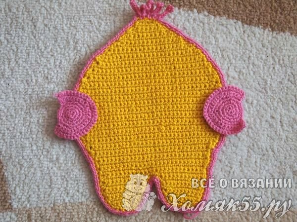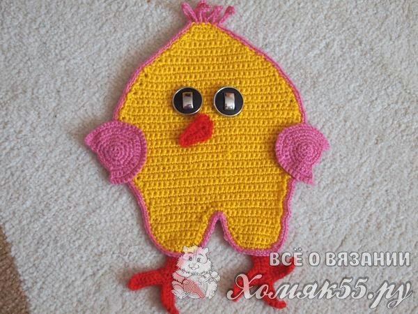 Совет: если вы планируете связать прихватку для своей кухни, а не для детской, лучше не используйте пуговицы, а свяжите глаза из пряжи. Так они будут устойчивее, если на прихватку придется поставить миску.