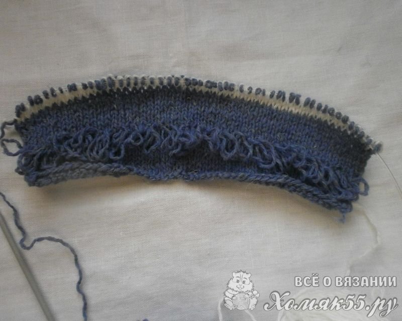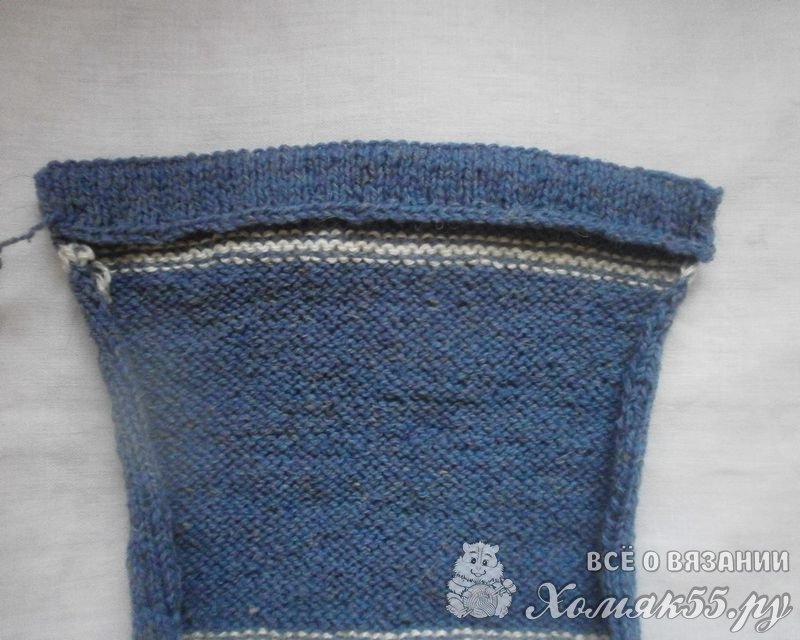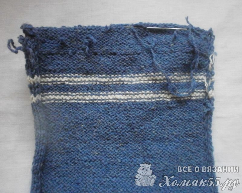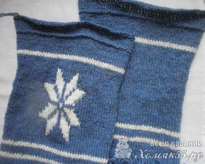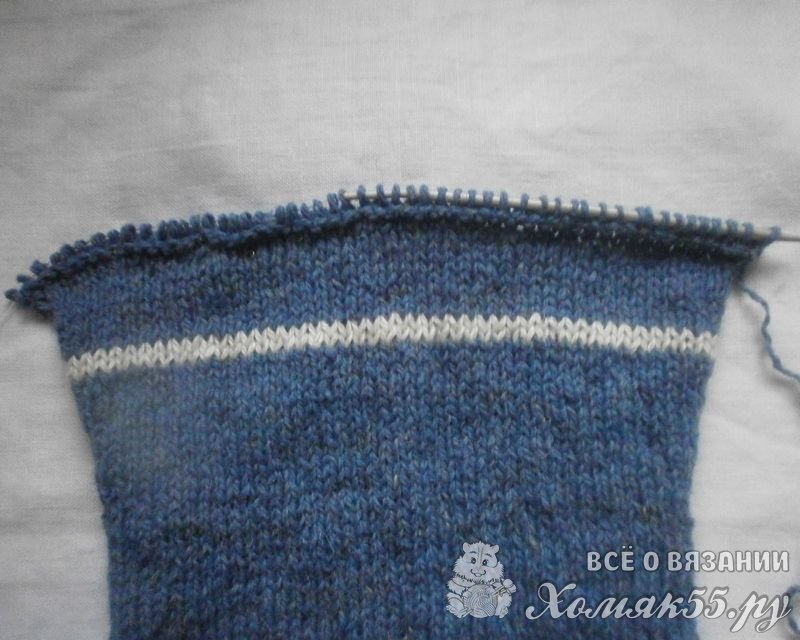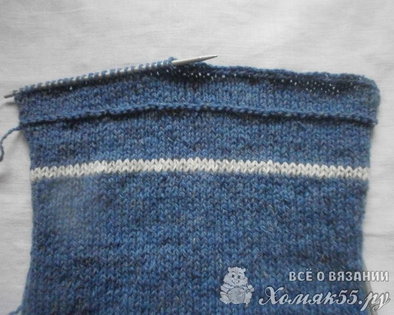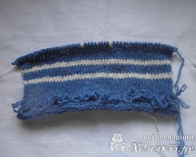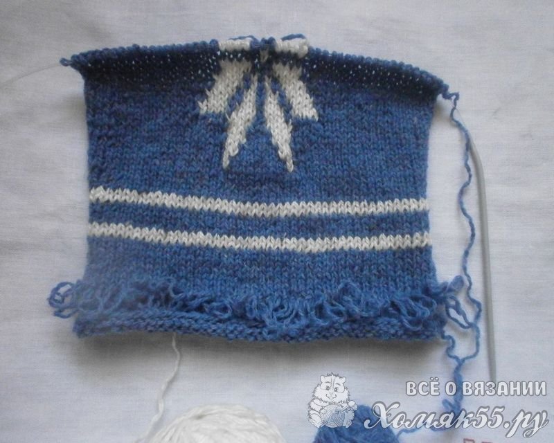 После узора вяжем 6 рядов голубой нитью, а затем 2 ряда белой.