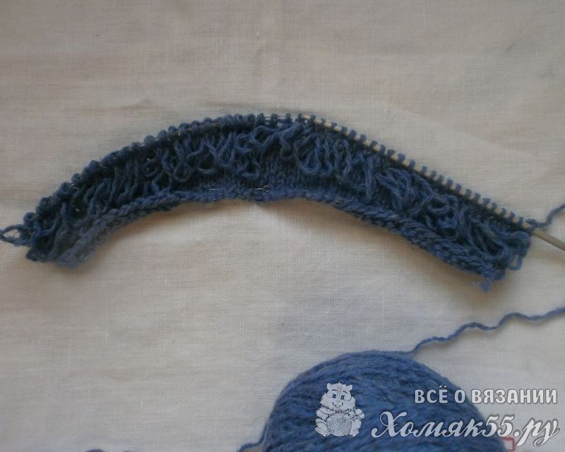 Теперь для украшения свяжем бахрому. Делаем так: Кромочная петля, дальше провязываем лицевую петлю. Третью петлю вытягиваем на нужную длину.