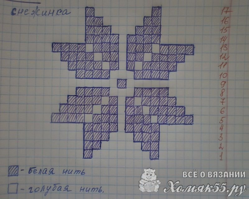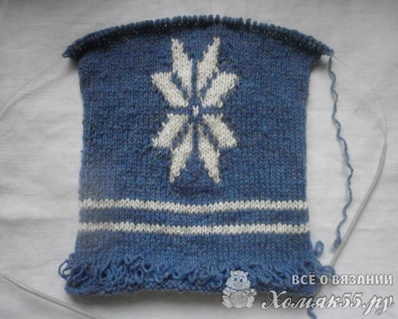 Затем 4 ряда: голубой нитью и опять 2 ряда: белой. Вяжем голубыми нитками 6 рядов лицевой гладью. С 7 ряда начинаем узор: «Снежинка» по схеме. Вязание начинаем с 20 петли, провязываем ее белой нитью. Через 7 петель – провязываем вторую петлю белой нитью.