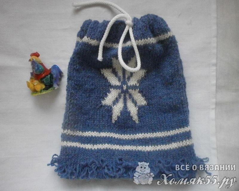 Заканчиваем вязание передней части мешочка голубой нитью. Вяжем 10 рядов лицевой гладью. Теперь 1 ряд изнаночными петлями, это нужно, чтобы легко загнулся край мешочка.