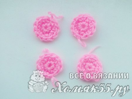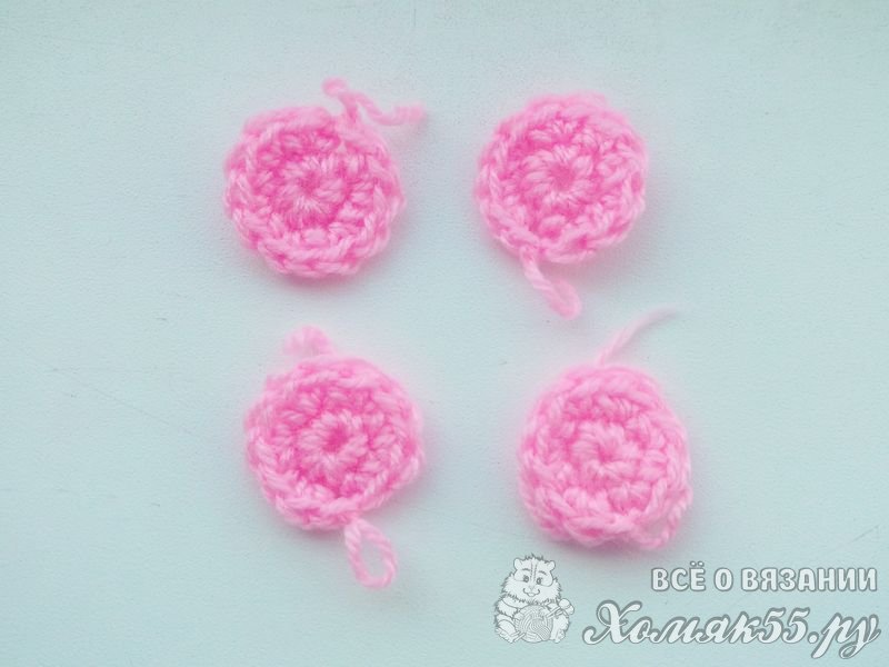 У нашего изделия будет 4 пальчика, поэтому нам нужно связать 4 небольших кружка из розовой пряжи. Для этого делаем начальную петлю и вяжем 2 воздушные. Затем в самую первую петельку выполняем 6 столбиков без накида. Во втором ряду мы должны увеличить количество столбиков в 2 раза, поэтому провязываем по 2 столбика без накида в каждый столбик предыдущего ряда.