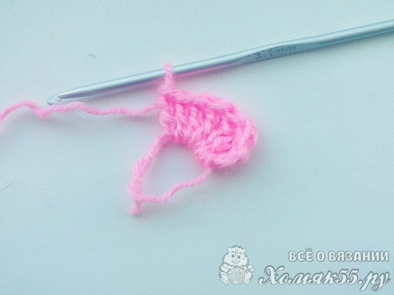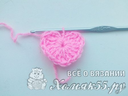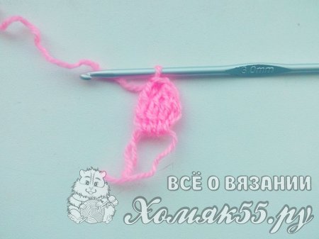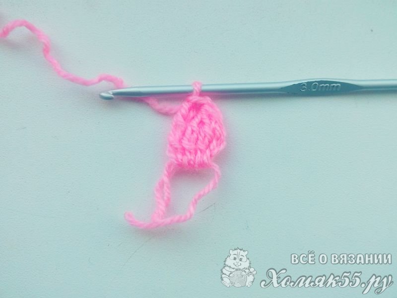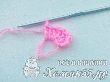 Она будет в форме сердечка. Вязание продолжаем пряжей розового цвета. Формируем скользящую петлю. Далее делаем 2 воздушные петли и в кольцо выполним 3 столбика с 2-мя накидами.