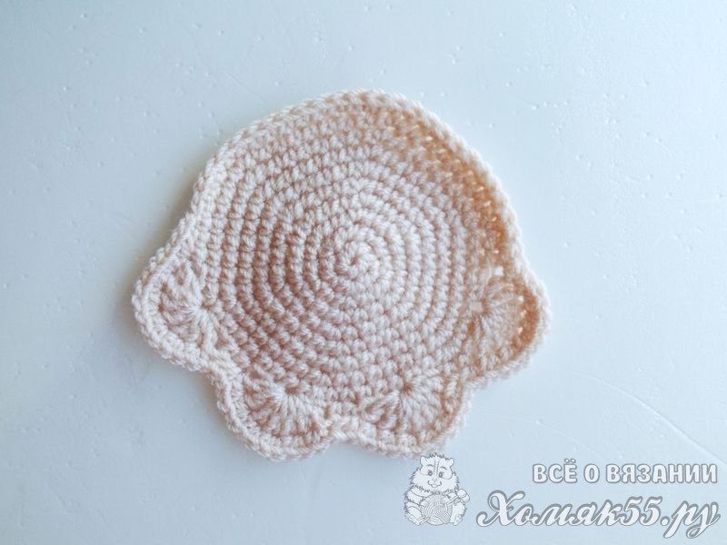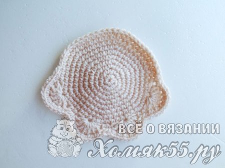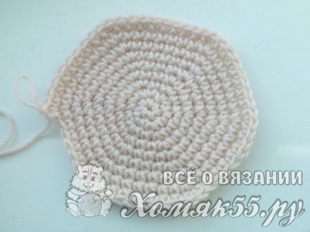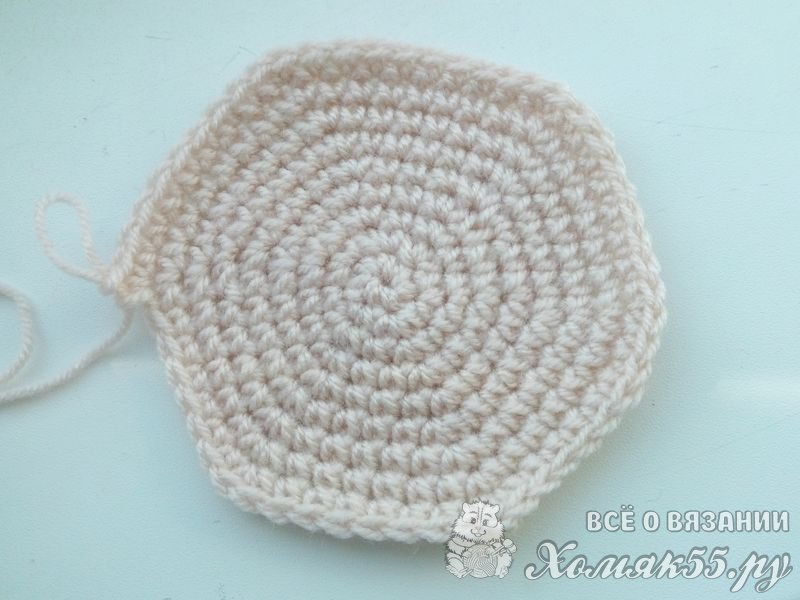 Ее вяжем пряжей бежевого цвета. Так же как и в пальчиках провязываем кольцо из 6 петель, затем, прибавляя в каждую петлю, увеличиваем их до 12. А далее будем вязать с прибавками в каждом ряду. Каждый раз их будет 6. В новом ряду прибавку провязываем через 1 петлю по кругу. Петель будет уже 18. Затем прибавляем через 2 петли по кругу. Это 24 петли в конце ряда. В новом ряду прибавку делаем через каждые 3 петли, затем через 4 и так далее по нарастающей, пока круг не будет состоять из 54 петель.