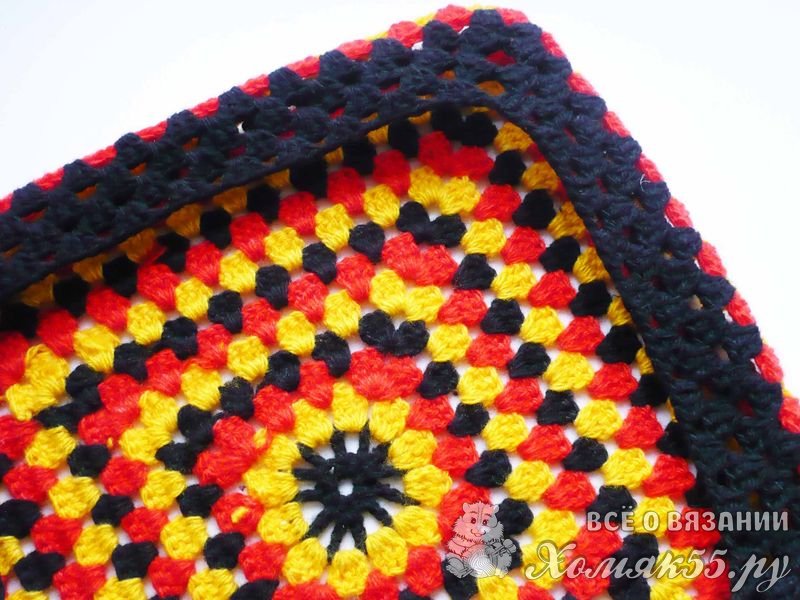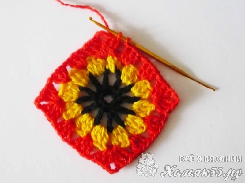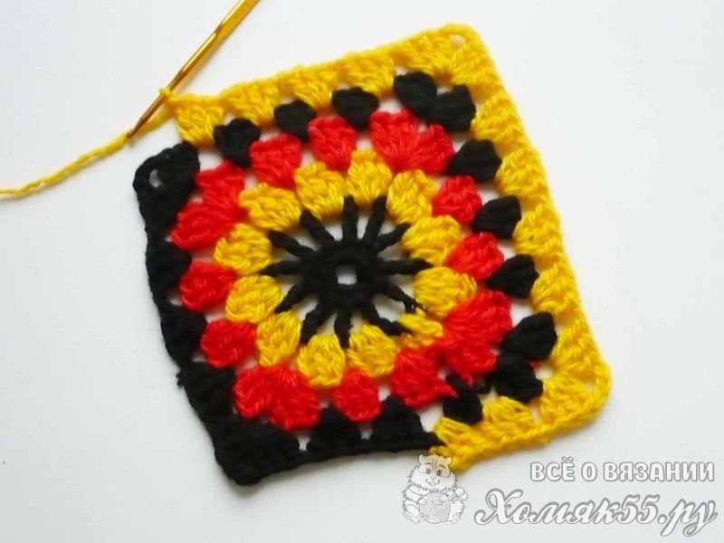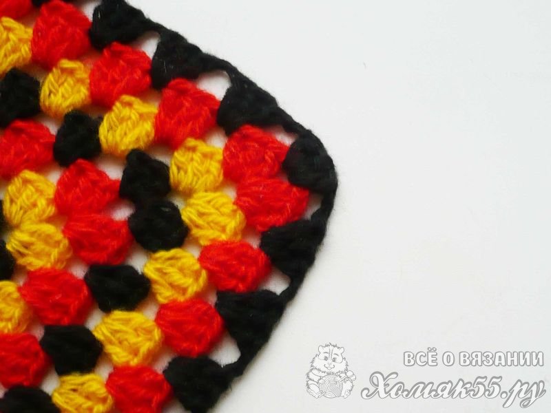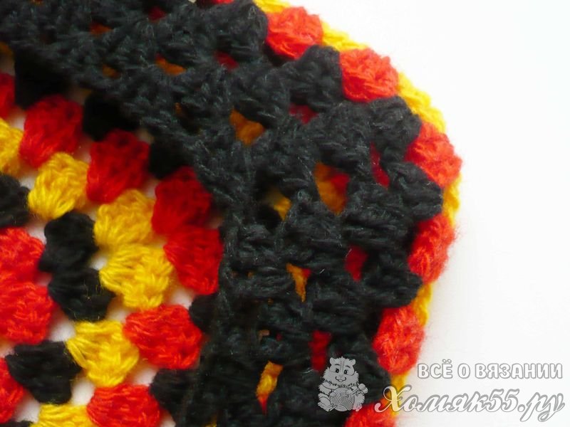 5 ряд. Переходим на черный цвет. Вяжем по той же схеме, что и предыдущий ряд. Только количество строенных столбиков увеличивается до трех на одной стороне квадрата.
