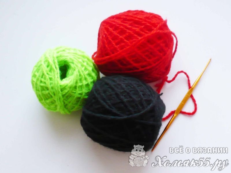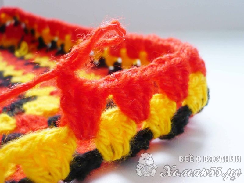 Я взяла три цвета: красный, желтый и черный. Цвет меняла после каждого ряда. Крючок № 3.