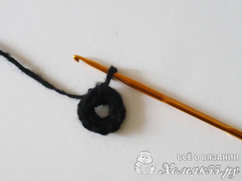1 ряд. 1 ВПП, 8 СБН на кольце. Ряд заканчиваем с помощью соединительной петли. При работе над следующим рядом, «хвостик» прячем в вязание.