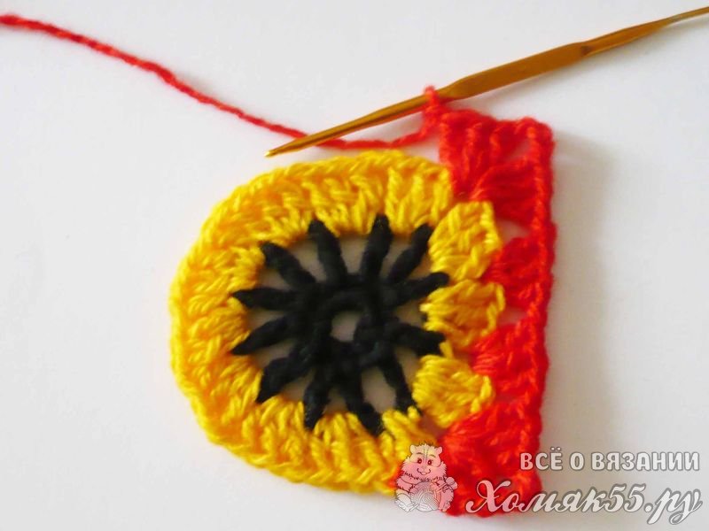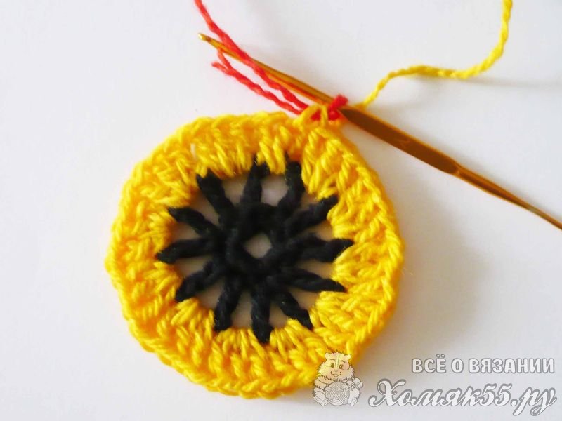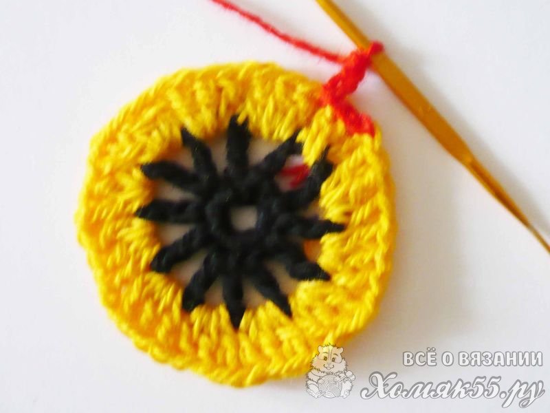 Ряды 6, 7, 8, 9, 10, 11, 12, 13 вяжем так же, чередуя цвета: черный, желтый, красный, черный, желтый, красный и так далее. Помним, что в каждом ряду количество строенных столбиков увеличивается и в 13 красном ряду их будет 11 на одной стороне.