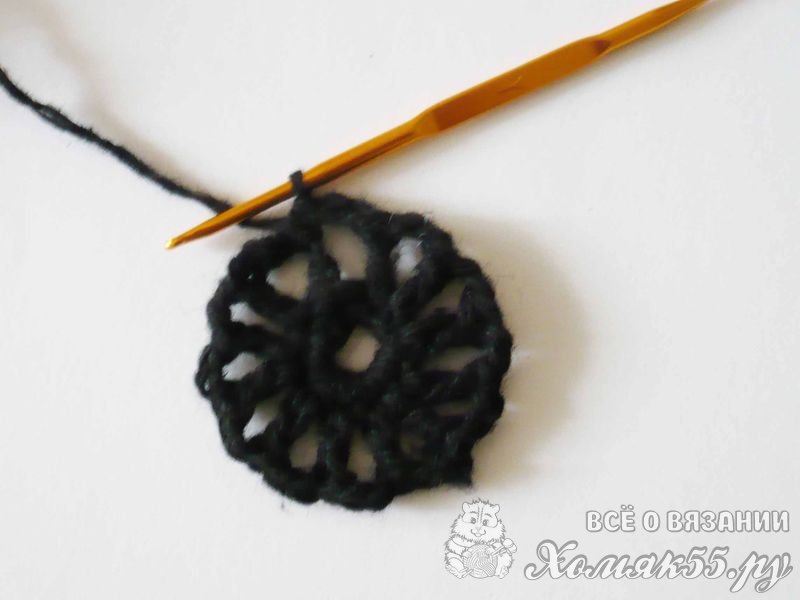 2 ряд. Продолжаем черной нитью. 5 ВП (из них 3 петли подъема, 2 ВП образуют арку). Нам нужно на кольце получить 12 ССН, вместе с тремя петлями подъема. Поэтому каждый третий столбик вяжем как УС. Между всеми столбиками арку из 2 ВП. Заканчиваем ряд соединительно петлей: вводим крючок в третью ВПП, вытягиваем черную нить, а 2 петли на крючке провязываем уже желтым цветом. Так меняя цвет, мы будем заканчивать КАЖДЫЙ ряд.