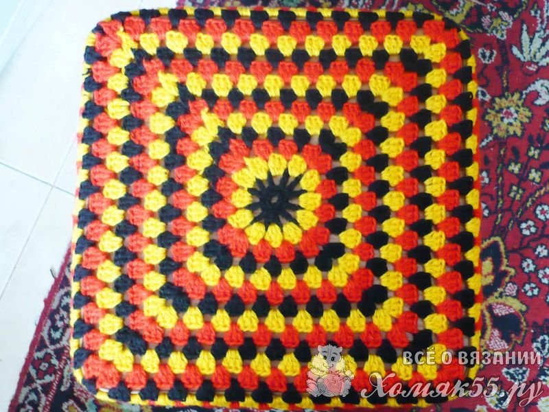 Вот такую веселую «сидушку» предлагаю вам связать для табурета. И рекомендую обязательно ввести черный цвет. Именно он придает изделию четкую графичность. Прежде, чем приступить к вязанию, измерим сидение табурета. Мой табурет имеет размер 32 х32. Нам необходимо знать эти цифры, чтобы чехол плотно прилегал к сидению.