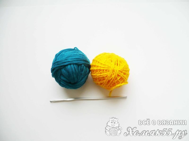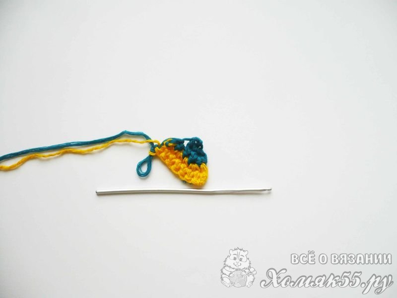 2 ряд. 1 СБН, УС, 1 СБН, УС, вторую половину последнего столбика провязываем, подхватив вторую нить, поворотную петлю вяжем уже одним желтым цветом.