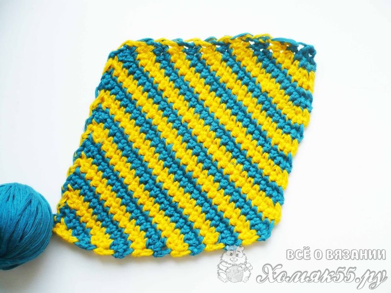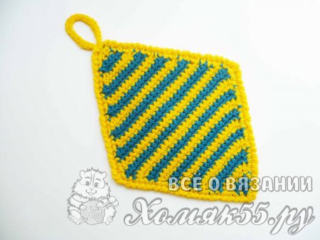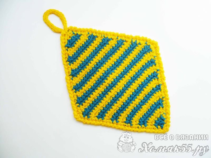 Продолжаю тему утилизации неходовых остатков пряжи. В этой прихватке яркие горизонтальные полоски несколько оживляют жесткую геометрическую форму. Ромб получается за счет того, что прибавления петель и убавления выполняются не в каждом ряду, а пропуская контрастную полоску. Если мы хотим получить не ромб, а квадрат, удваивать петли нужно в каждом ряду.