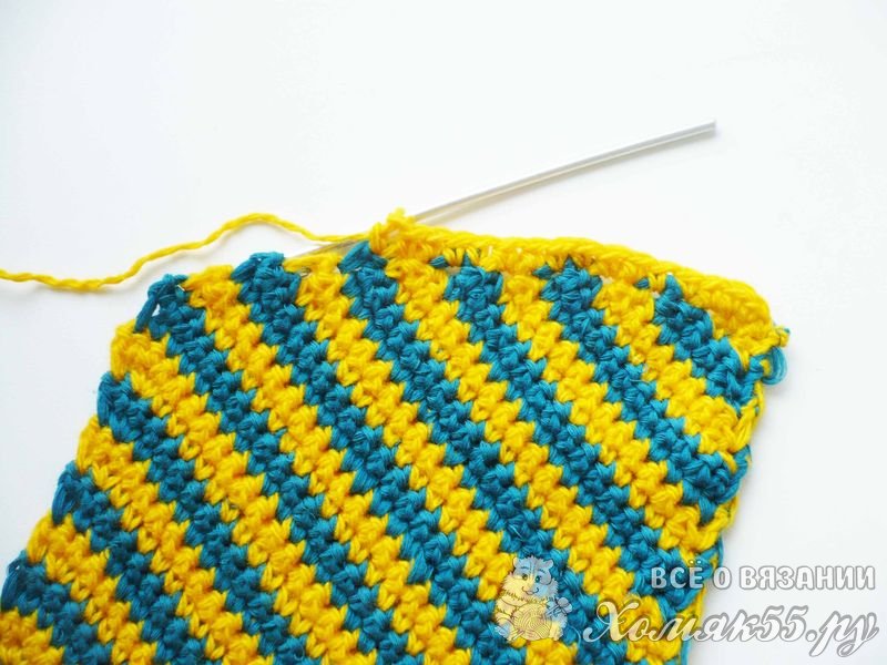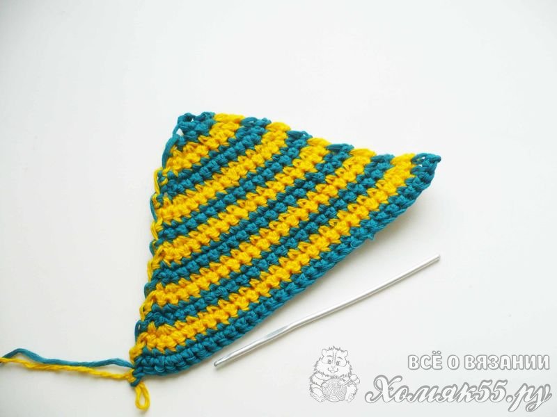 5, 6 ряды вяжем, не удваивая столбики. Таким образом, чередуя желтую и темную нити, вяжем до 20 ряда.