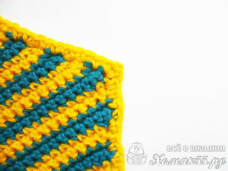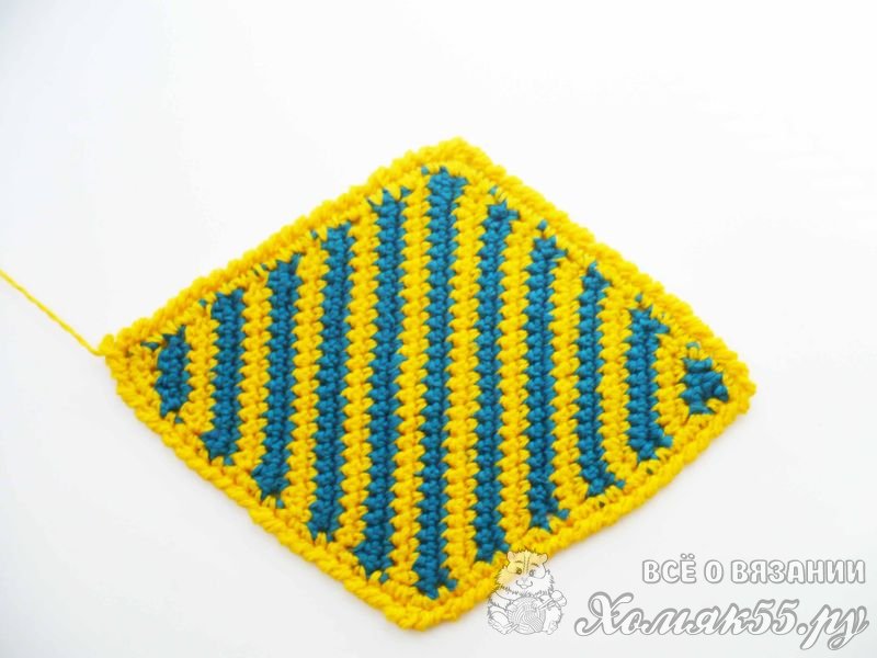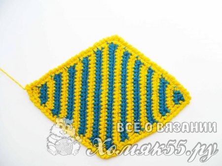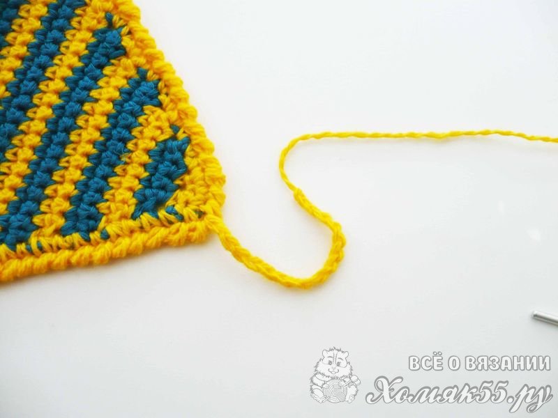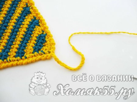 Провязав в 21 ряду 5 столбиков без накида темной нитью, переходим на желтую нить, а темную обрезаем и ввязываем «хвостик» в следующем желтом ряду. Убавили до трех столбиков и провязываем их вместе. Нить завязали, но не обрезаем. Желтой нитью начинаем обвязывать ромб по внешним сторонам.