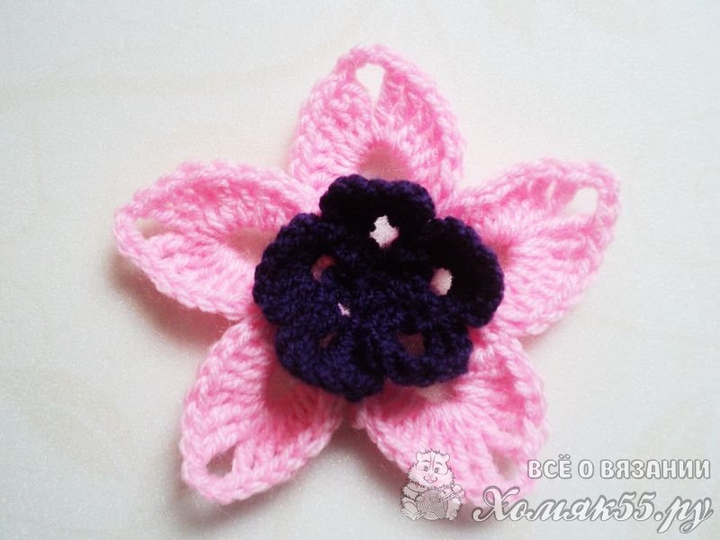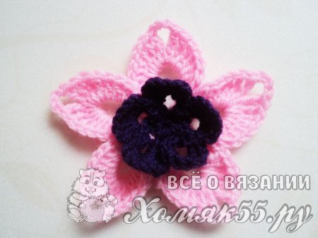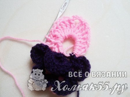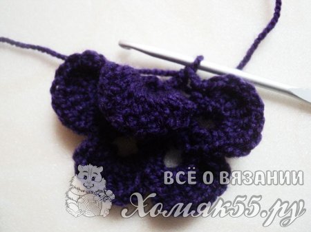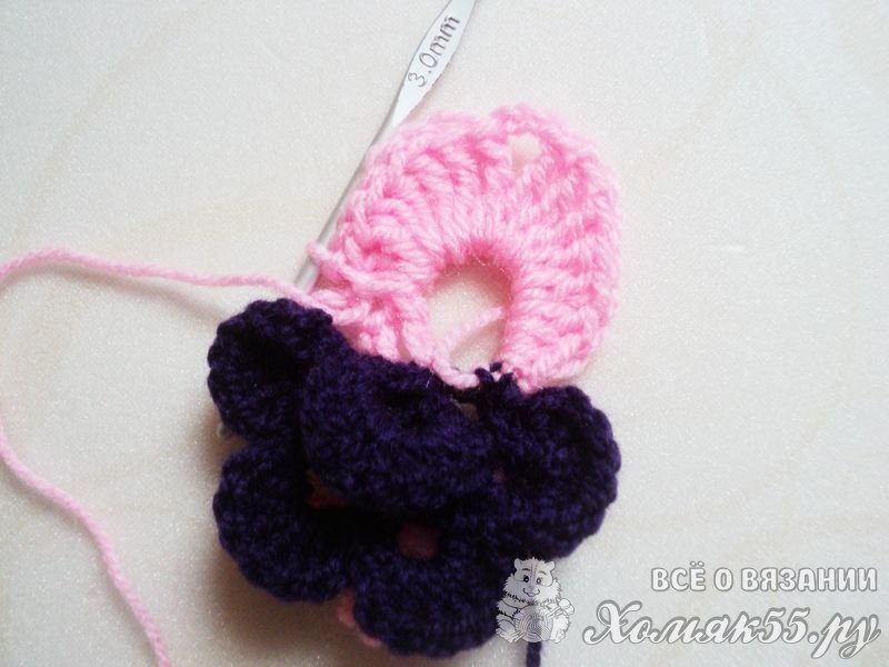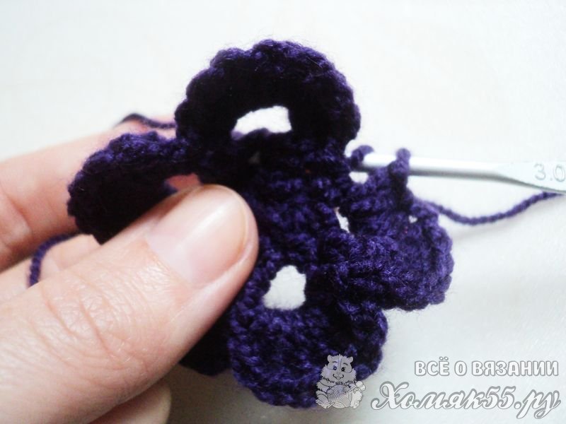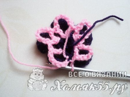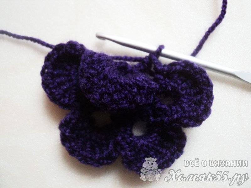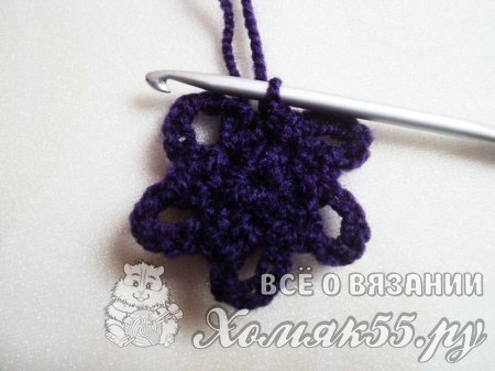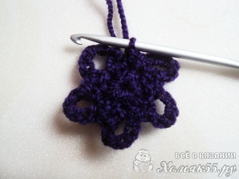 Он будет состоять из 5-ти лепестков. Фиолетовой пряжей делаем скользящую петлю и в нее вяжем 10 СБН (столбиков без накида). Соединяем ряд и затягиваем петлю. Провязываем 1 СБН и сразу формируем 5 ВП и в эту же точку вяжем еще 1 СБН. Пропускаем петлю и повторяем. То есть вяжем 1 СБН, 5 ВП и еще 1 СБН. Так будем вязать до конца ряда. Таким образом, формируем 5 лепестков. Соединяем ряд.