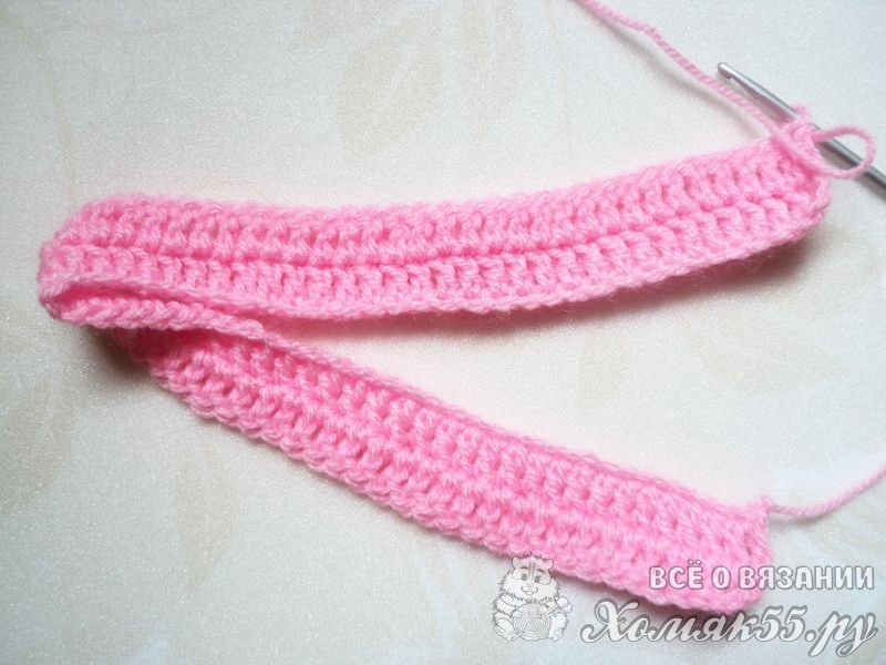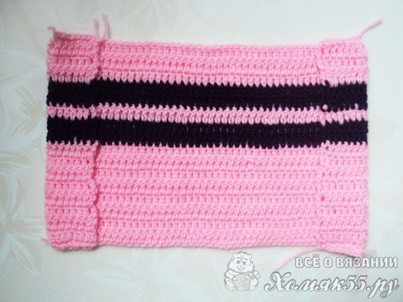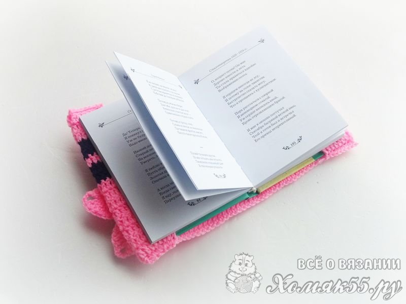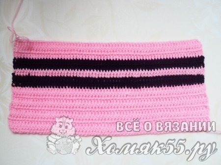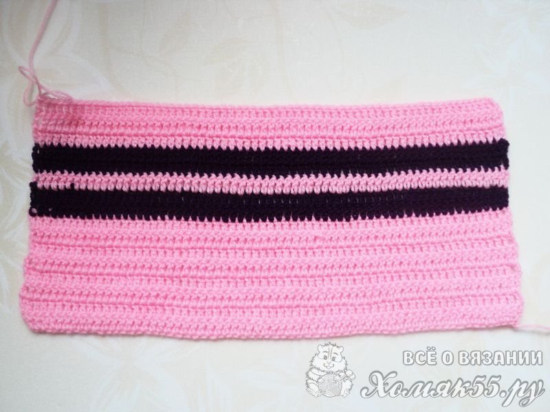 Вяжем далее рядочки ССН до середины книги. Затем мы просто поменяем нить на фиолетовую и вяжем еще 2 ряда ССН. Снова меняем нить на розовую и вяжем 1 ряд. Опять меняем нить и вяжем 2 ряда. Далее до самого конца книги вяжем розовой пряжей ряды ССН.