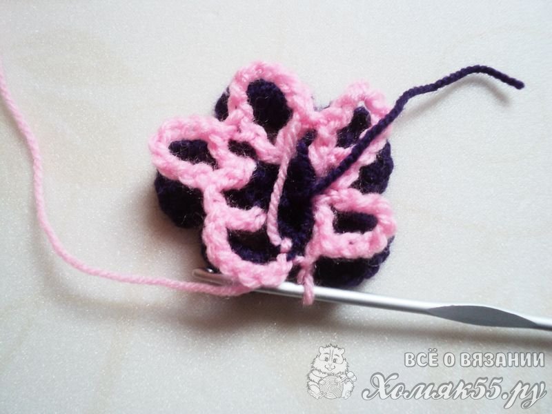 Меняем пряжу на розовую. Теперь нам нужно так же сформировать 5 арочек. Поэтому делаем 7 ВП и вяжем 1 ССН в эту же точку, затем делаем 1 ВП. Далее продолжаем вязание так же. То есть вяжем 1 ССН в центральную петлю лепестка, делаем 7 ВП и еще 1 ССН сюда же.